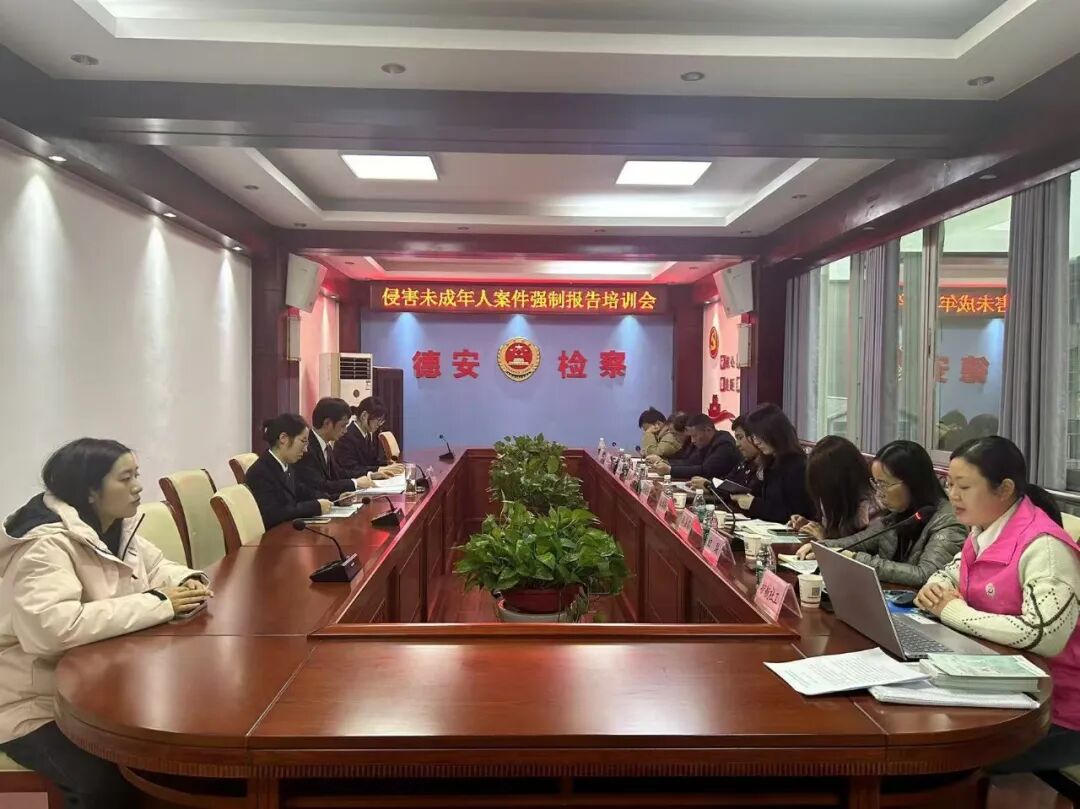 为加强未成年人综合司法保护,近日,德安县检察院牵头组织县监察委、公安局、卫健委、教体局、民政局、司法局、团委、妇联八部门及护航社工组织,开展关于落实强制报告制度专题培训。
