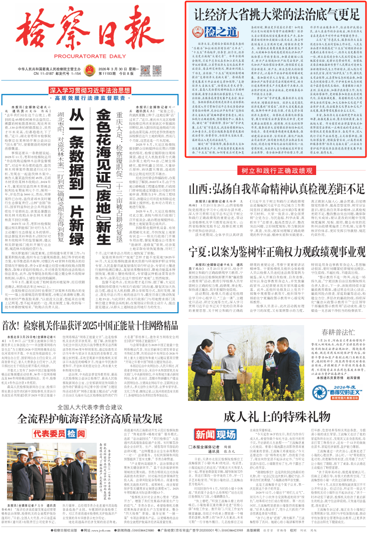 经济大省,是稳住全国经济基本盘的“压舱石”和拉动经济增长的“火车头”。“十五五”开局起步,任务重、担子沉,经济大省更应挑起“大梁之责”。今年全国两会期间,习近平总书记在参加江苏代表团审议时强调,江苏等经济大省处在改革开放前沿,要在研究新情况、解决新问题上下功夫、出经验。“十五五”规划纲要明确提出“支持经济大省挑大梁”。推动高质量发展离不开法治的支撑和保障,“支持经济大省挑大梁”,检察机关责无旁贷。近日,最高人民检察院调研组在江苏调研时强调,要努力在强化检察监督上下功夫、出经验,在服务高质量发展中走在前、做示范。各级检察机关特别是经济大省检察机关要深入学习贯彻习近平总书记重要讲话重要指示精神,充分认识中央作出“支持经济大省挑大梁”战略部署的重要意义,树立和践行正确政绩观,坚持围绕中心、服务大局,锚定“新”字强保障、紧扣“韧”字护发展、立足“美”字惠民生,找准检察履职切入点和着力点,自觉扛起服务高质量发展的政治责任、检察责任,为经济大省挑大梁、谋新局注入更足的法治底气。
